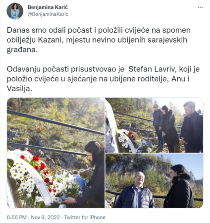 Подсјећамо, Карићева је само пар сати прије поставила објаву гдје одаје почаст убијеним Бошњацима од стране „агресорске гранате“.