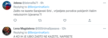 Још неколицина људи је поручило Карићевој да оваквим објавама вријеђа жртве и њихове породице небулозним изјавама, те да је нејасно зашто није навела ко их је и како убио.