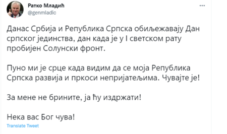 Генерал је у свом кратком Твитер обраћању поручио да ће он издржати и да Република Српска треба да се развија и пркоси непријатељима.