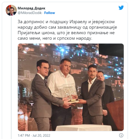 Ово је велико признање не само мени, него и српском народу – објављено је на Твитер профилу Додика.