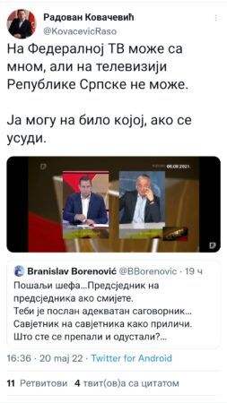 Настављен ТВИТЕР РАТ: Није ти сметало на Федералној ТВ?Настављен је твитер рат Радована Ковачевића и Бранислава Бореновића.