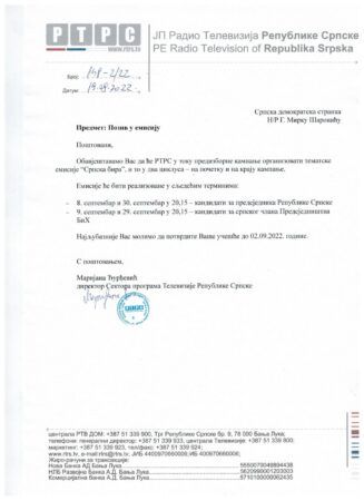 Позив Мирку Шаровићу упућен је 19. августа, мејлом и поштом. Након тога, више пута смо мејловима обавјештавали СДС о правилима и темама емисије, те их позивали на састанак, али одговор нисмо добили.