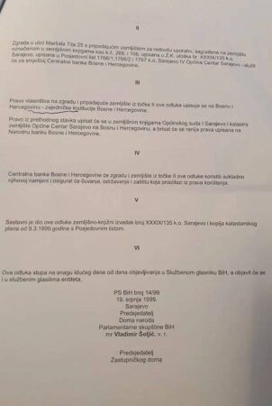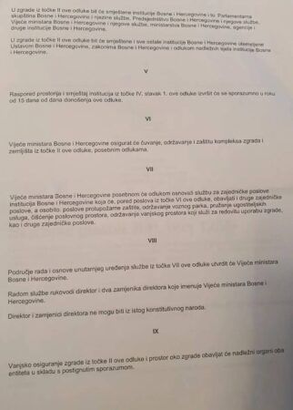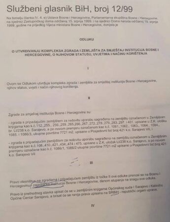 – Е сад једно иронично питање: Пошто је Уставни суд БиХ, у једној од својих многобројних политичких вратоломија, рекао да је термин „заједничке институције“ неуставан, да ли би ваљало поништити акте Парламентарне скупштине БиХ (Представничког дома и Дома народа) објављене у Службеном гласнику БиХ бр. 12/99 , па тиме поништити и пренос власништва и иселити све те институције? – навела је Цвијановић на Инстаграм профилу.