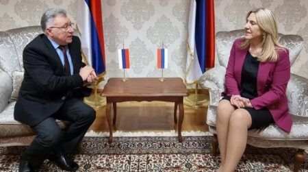 Српски члан и предсједавајућа Предсједништва БиХ Жељка Цвијановић разговарала је данас са амбасадором Руске Федерације у БиХ Игором Калабуховом о политичким и економским приликама у Републици Српској и БиХ, као и другим актуелним темама.