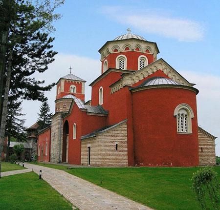 Манастир Жича код Краљева добио је име по боји спољашње фасаде која представља крв Христову и посвећен је Вазнесењу Христовом.