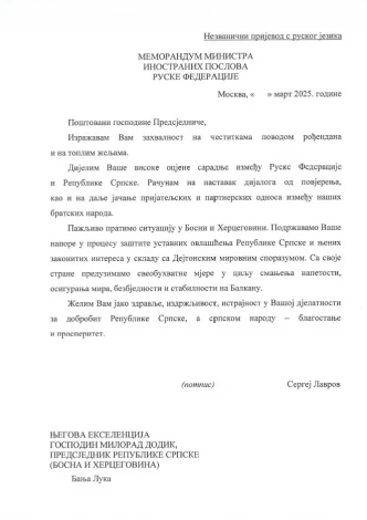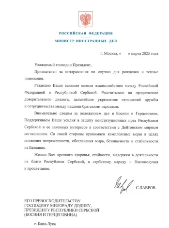 – Са своје стране предузимамо свеобухватне мјере у циљу смањења напетости, осигурања мира, безбједности и стабилности на Балкану. Желим Вам јако здравље, издржљивост, истрајност у Вашој дјелатности за добробит Републике Српске, а српском народу благостање и просперитет – навео је Лавров.