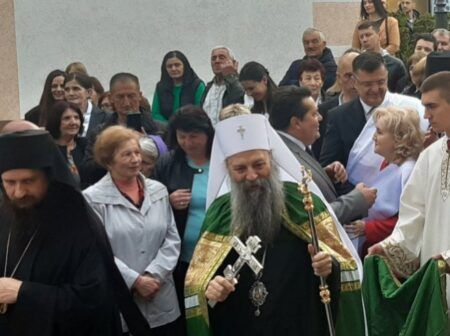 Патријарху саслужује свештенство Српске православне цркве.